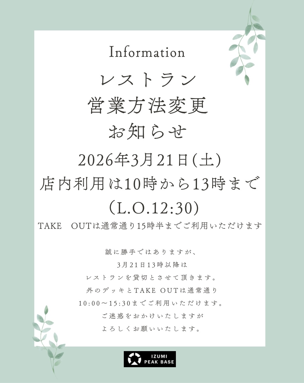 【3月21日(土) レストラン営業日について】レストラン貸切のご予約があり営業時間が変更になります。ご了承ください。