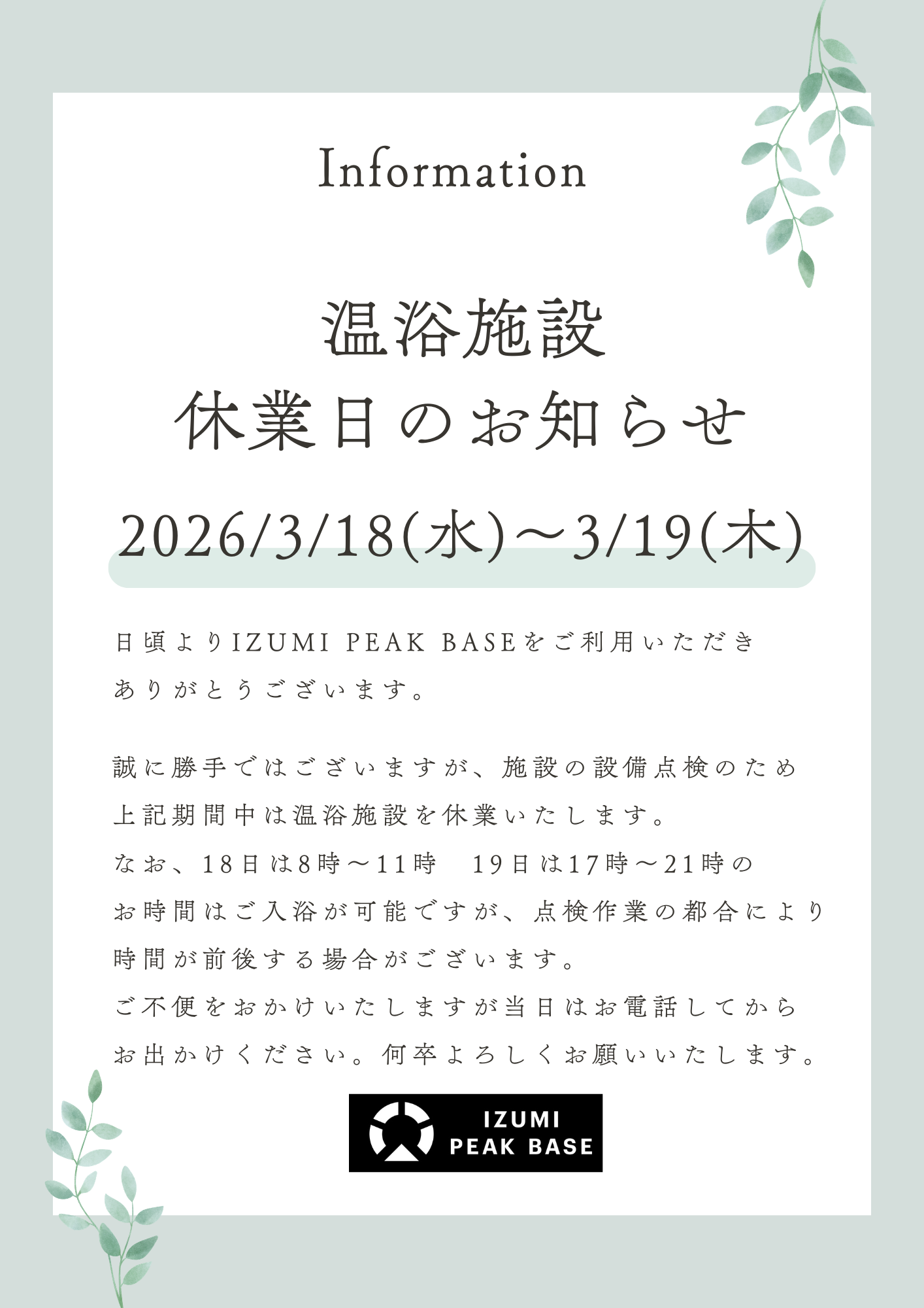 詳細を見る【温浴施設の設備点検】3月18日(水)・19日(木) 温浴施設の設備点検を行います。日帰り入浴をご希望のお客様は、お手数ですがお電話してからお出かけください。